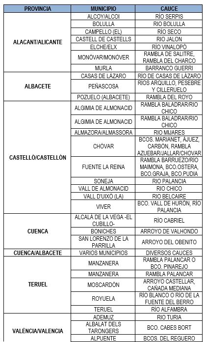 En las siguientes tablas, se listan las actuaciones otorgadas, desglosada por provincia, municipio, y el cauce afectado.