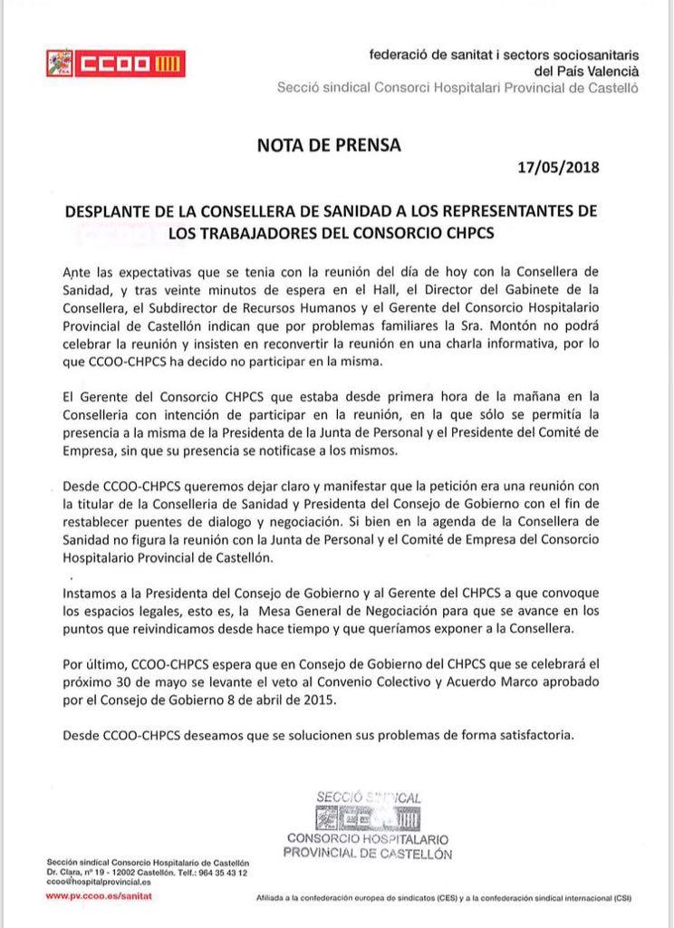 “Desde CCOO- CHPS queremos dejar claro y manifestar, que la petición era una reunión con la titular de la Conselleria de Sanidad y presidenta del Consejo de Gobierno con el fin de establecer puentes de diálogo y negociación. Si bien, manifiestan, en la agenda de la consellera de Sanidad no figura la reunión con la Junta de Personal y el Comité de Empresa del Consorcio Hospitalario de Castellón”.