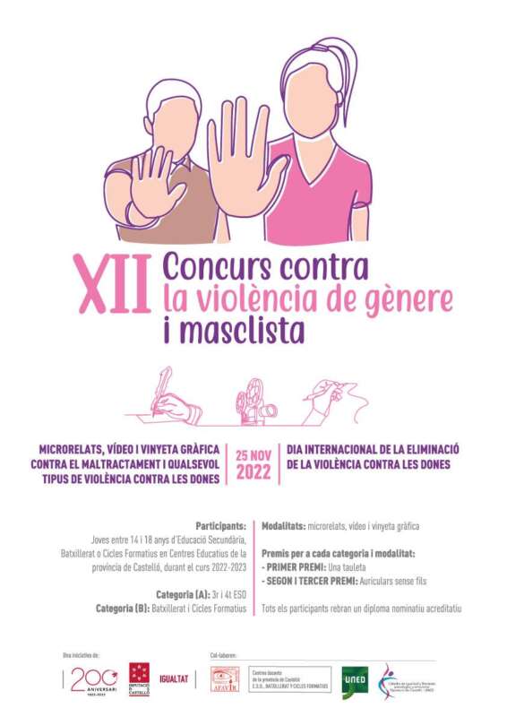 La Diputació de Castelló ha convocat, amb motiu del Dia Internacional de l'Eliminació de la Violència contra la Dona (25 de novembre), el XII Concurs contra la Violència de Gènere i Masclista al qual es podran presentar joves entre 14 i 18 anys d'Educació Secundària o cicles formatius de centres educatius de la província de Castelló, durant el curs 2022-2023.