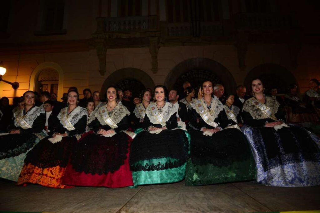 El presidente, Carlos Mazón, acompañado por la alcaldesa, Begoña Carrasco, y las reinas Lourdes Climent y Vega Torrejón, ha saludado una por una a las madrinas de cada gaiata y los miembros de su comisión, antes de ocupar un espacio en la tribuna, donde también se encontraban las reinas y sus cortes de honor.