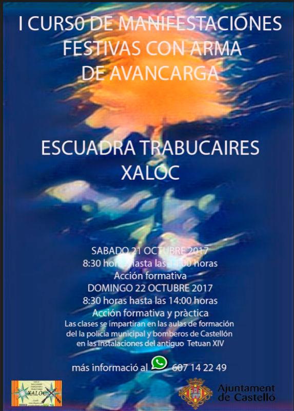 La escuadra de trabucaires de Castelló ante la próxima entrada en vigor del nuevo reglamento de explosivo, organiza el I curso de manifestaciones Festivas con armas de avancarga que se realizaran en las aulas de formación del antigua cuartel Tetuan 14 días 21 y 22 octubre de 8:30 a 14 horas inscripciones al telf o whatsap 607142249