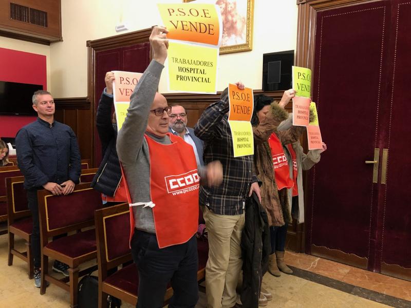 En el salón de plenos, varios trabajadores del Hospital Provincial se posicionaron en primera fila. Llevaban pancartas plegadas e iban identificados con los logotipos de CCOO. Esperaban que el pleno aprobara la Declaración Institucional que el PP les había prometido que llevaría al pleno de hoy.
