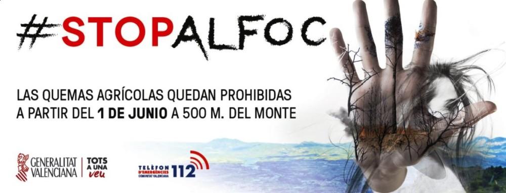 La campaña se denomina 'StopAlfoc'. Establece la prohibición tajante de realizar quemas agrícolas a menos de 500 metros de zona forestal, que entra en vigor a partir de hoy, 1 de junio.