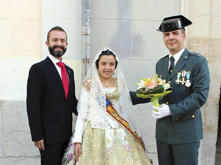 El teniente de la Guardia Civil de Borriana, Rafael Pérez, ha obsequiado con dos ramos de flores a las reinas falleras de Borriana. Después de hacerse la tradicional foto de familia ante las puertas de la Mercé, la Guardia civil de la localidad ha invitado a las autoridades al tradicional vino de honor.