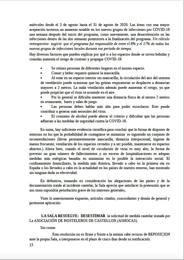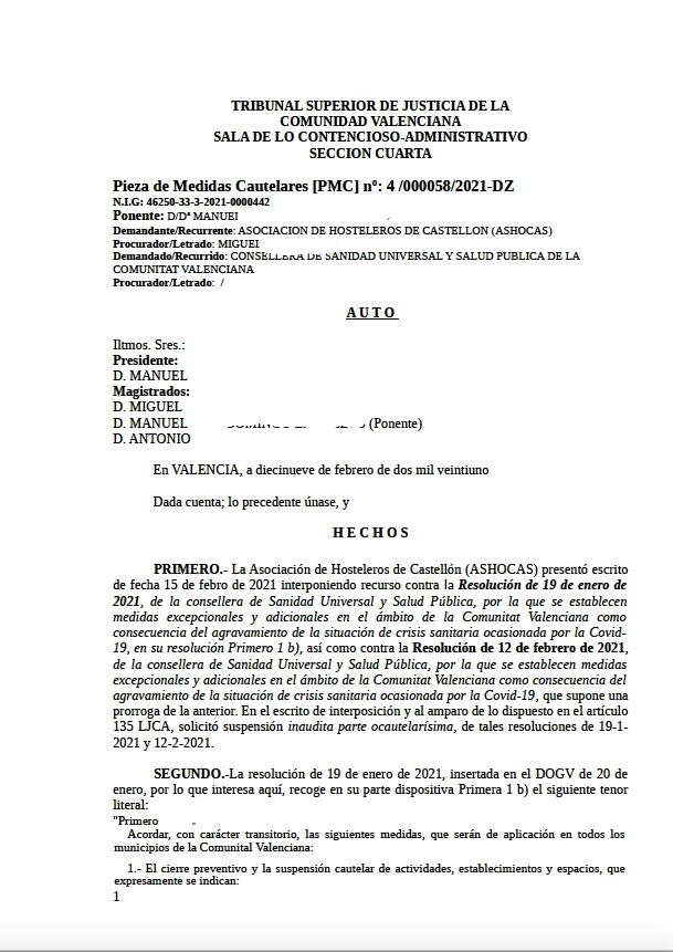 Como se recordará, la Asociación de Hosteleros de Castellón, Ashocas, presentó un recurso en el TSJ contra las restricciones de la Generalitat al sector, y solicitó también medidas cautelarísimas para que el Tribunal de la Comunitat de Valencia, como ya hizo antes el del País Vasco, declarara la apertura inmediata de los negocios.