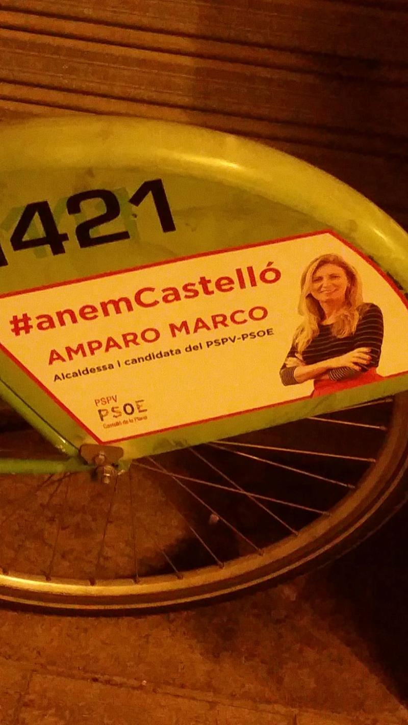 La sorpresa surgía hace unos días cuando algunos usuarios encontraron un cartel publicitario en las ruedas de las bicicletas del servicio municipal Bicicas, En el que se exhibe la propaganda electoral de la candidata socialista a la alcaldía de Castellón. La propaganda, además de llevar el lema de campaña y la foto de Amparo Marco, utiliza la terminología de “candidata y alcaldesa”.