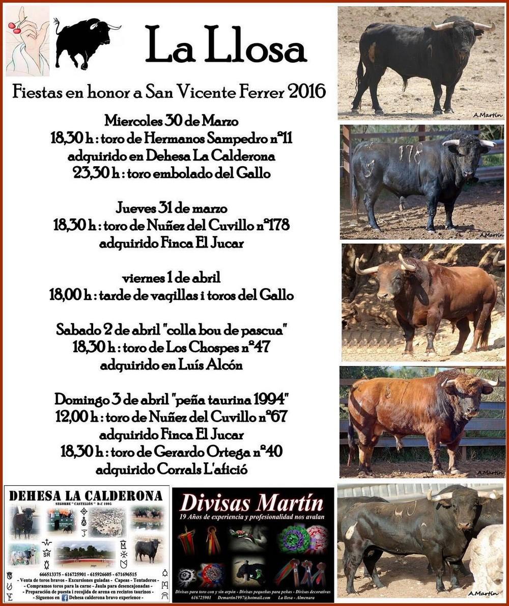 La Llosa ha dado a conocer la programación taurina de las fiestas de San Vicente Ferrer 2016. Desde el 30 de marzo al 3 de abril los astados de reconocidas ganaderías serán los protagonistas de unas celebraciones que organizan el Ayuntamiento de la localidad y los clavarios de las fiestas.