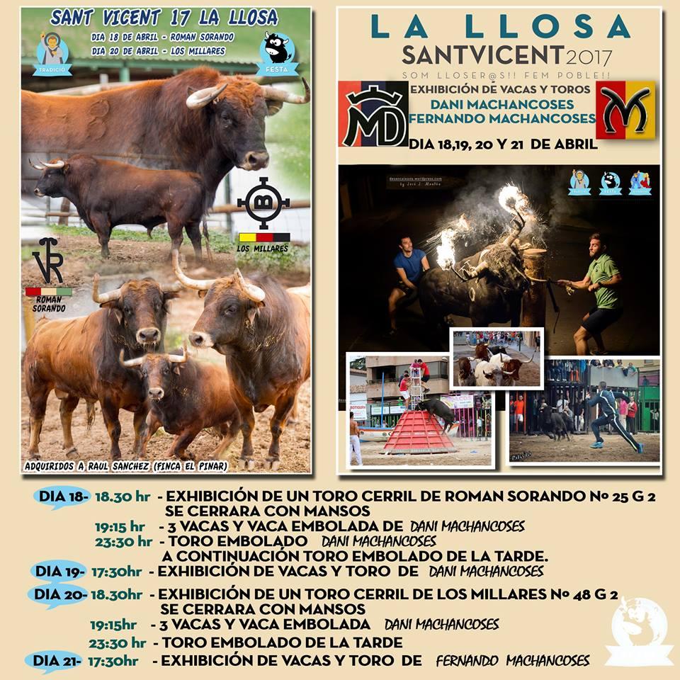 El día 19, la programación continúa por la tarde con la exhibición de vacas y un toro de Dani Machancoses. Mientras, el jueves 20, la ganadería Los Millares llevará a La Llosa un toro cerril que se exhibirá por la tarde y se embolará por la noche. A las 19:15 horas se soltarán vacas de Dani Machancoses.