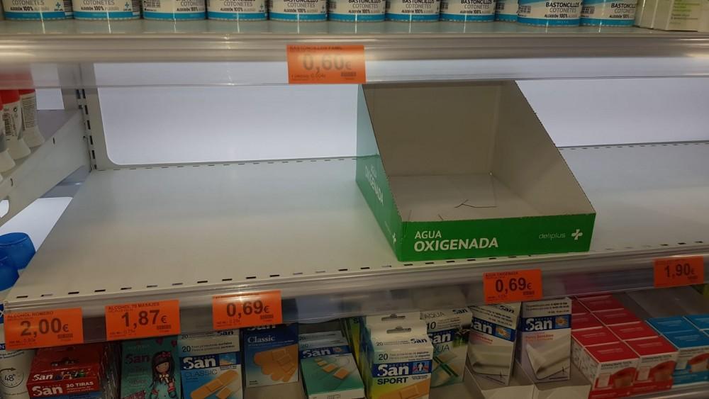 Estantes completamente vacíos, sobre todos los que se refieren a productos sanitarios: alcohol, agua oxigenada e incluso papel higiénico.