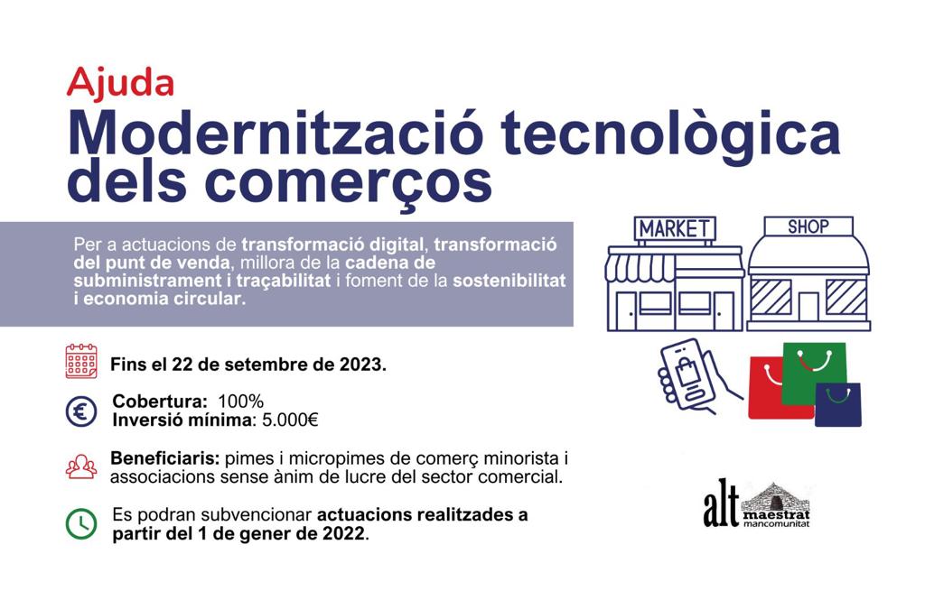 Así pues, hasta el 22 de septiembre los comercios también se pueden ver beneficiados con una ayuda para modernizarse tecnológicamente. A partir de una inversión mínima de 5.000 euros, el programa está dirigido a actuaciones de transformación digital, transformación del punto de venta, mejora de la cadena de suministro y trazabilidad y fomento de la sostenibilidad y economía circular.