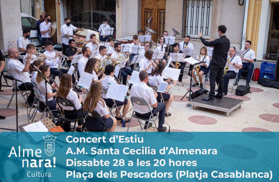 El sábado, dentro del ciclo "Música Segura a la Plaça" llegará el turno de l'Associació Musical Santa Cecilia d'Almenara que ofrecerá su tradicional Concert d'Estiu, que será en la plaça dels Pescadors de la Playa Casablanca a partir de las 20 horas. Será un auténtico placer volver a escuchar a los músicos y músicas locales en un concierto muy esperado.