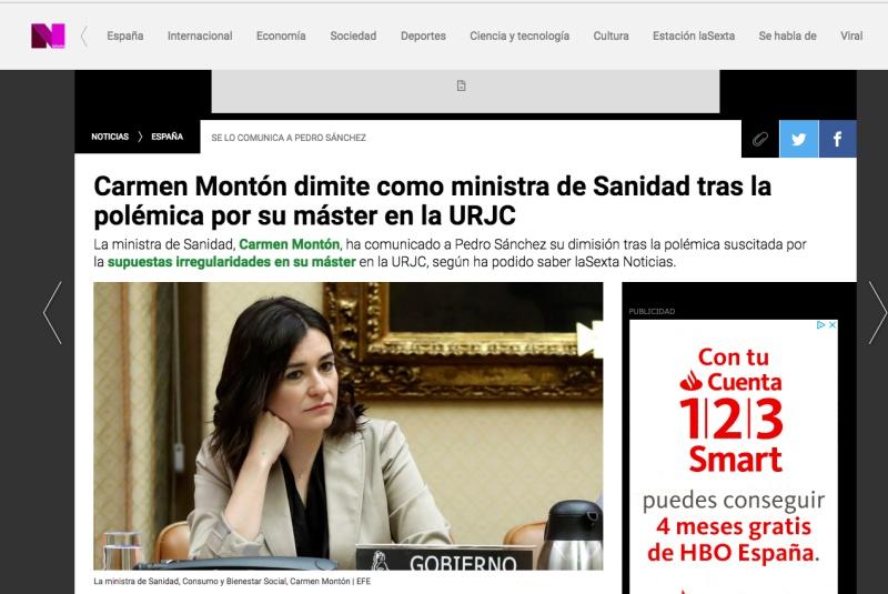 La ministra de Sanidad, Carmen Montón, ha anunciado en una comparecencia pública, su dimisión como miembro del Gobierno de Pedro Sánchez. Como ya le ocurrió a Cristina Cifuentes, en el PP de Madrid, las irregularidades publicadas en torno a su Máster, (el mismo que Cifuentes dijo haber cursado), en la Universidad Rey Juan Carlos, habrían precipitado su caída, aún después de que Pedro Sánchez le hubiera manifestado públicamente todo su apoyo y credibilidad esta misma tarde.