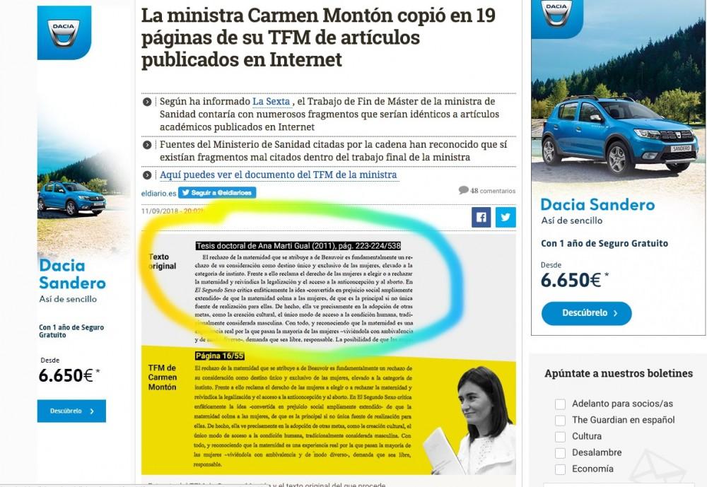 Tal como apunta también en su artículo, Eldiario.es, Gran parte de la tesis recoge textos de la Tesis doctoral de la profesora de la Universidad Jaume I de Castellón, Ana Martí Gual.