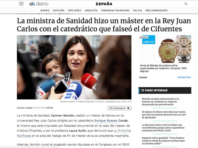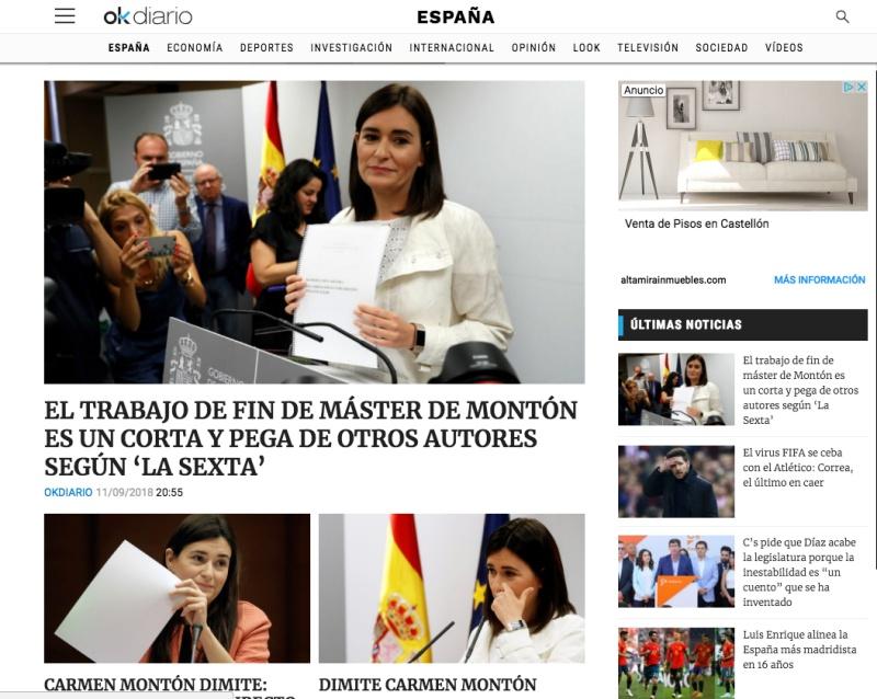 Carmen Montón ha presentado su dimisión como ministra de Sanidad del Gobierno de Pedro Sánchez, por el mismo máster que tumbó a la ex-presidenta de Madrid, Cristina Cifuentes. Las noticias sobre la coincidencia de ambos másters ha sido publicada durante los últimos días por varios diarios digitales, y algunas de las irregularidades que Montón ha negado, confirmadas por la universidad Rey Juan Carlos. La puntilla ha sido el análisis de su TFM por la Sexta, que desvela que plagió sus textos sin referenciarlos, entre otras personas a la profesora de la UJI, Ana Martí Gual. Mª Luisa Carcedo, nueva ministra.