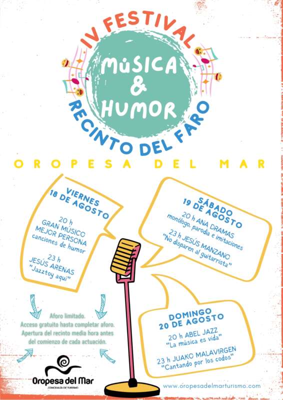 Oropesa del Mar celebrará del 18 al 20 de agosto el IV Festival de Música & Humor, una actividad organizada desde la concejalía de turismo y en la que su concejal, Rafael Albert, ha querido dar continuidad ya que ha tenido gran acogida en las ediciones anteriores. Los Jardines del Faro acogerán estas sesiones que serán gratuitas hasta completar aforo y que volverán a convertir el municipio en un destino atractivo para disfrutar del fin de semana.