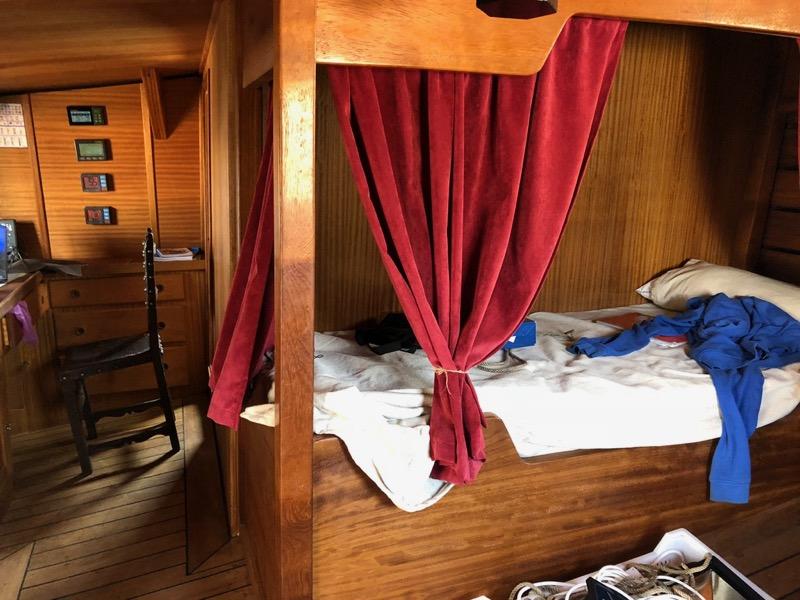 Entre las curiosidades, la cama del capitán, la única de la nave, que resultaría bastante pequeña para un navegante medio de la actualidad, con sus cortinajes de terciopelo rojo... Entonces la gente era más bajita... y vivía menos.