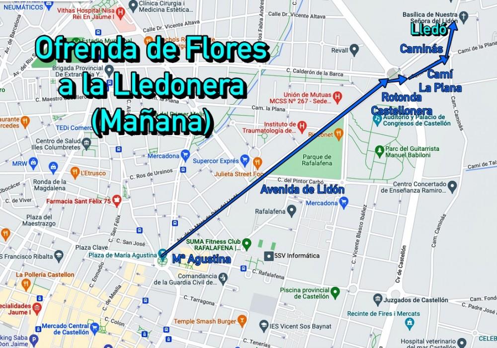 La ofrenda de Flores a la Lledonera está programada, desde el mes de enero con un desvío por el Camí la Plana y el Caminás, para evitar la zona de obras de la avenida de Lidón. Así lo han confirmado Pepe Ferrer desde la Junta de Fiestas del Patronato, que ya entregó su itinerario al departamento de Movilidad. El concejal de Fiestas, Omar Braina, sin embargo, afirma tajantemente que esto no es así, porque la Ofrenda mantendrá su itinerario habitual por la avenida de Lidón. El equipo de Gobierno pedirá a la concesionaria de las obras, que deje libere este tramo. Si será o no posible...