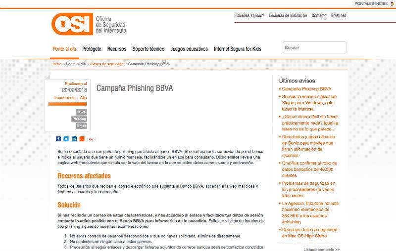 La Oficina de Seguridad del Internauta (OSI), perteneciente al instituto Nacional de Ciberseguridad (Incibe), ha informado de la existencia de alerta alta por una campaña de phishing que afecta al banco BBVA.