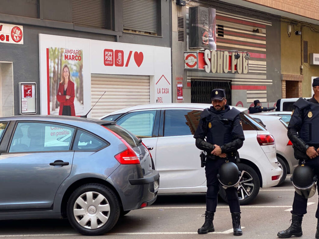 Sobre las 13.00 horas, algunos de los manifestantes que se encontraban en la plaza de La Muralla se han trasladado hasta la calle Carcagente en otra protesta convocada por VOX frente a la sede del PSOE en Castelló.