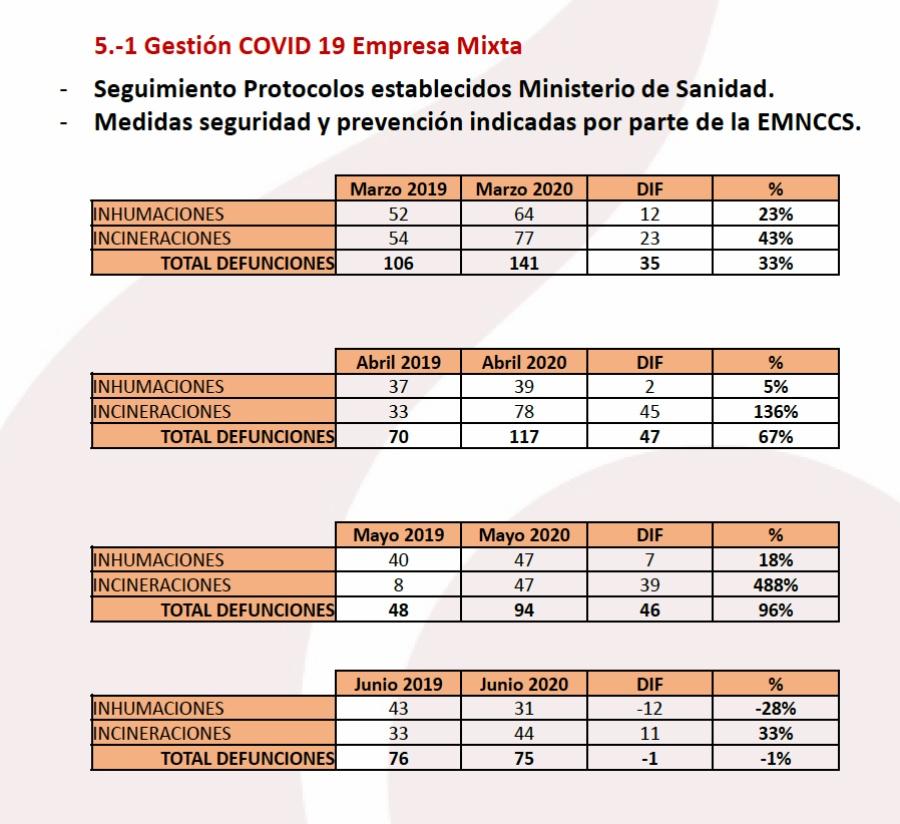 De esta forma, el numero de incineraciones duplicó ya al de inhumaciones en el mes de marzo, con un incremento del 43% sobre el mismo mes de 2019. En abril de 2020, el incremento de las incineraciones llego al 136% sobre el 2019; y en mayo se incrementaron en un 488%.