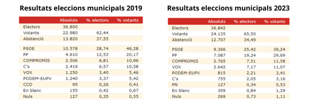 En aquestes eleccions la principal força ha sigut el PSPV-PSOE, al igual que ja va ocórrer en 2019. A més, han augmentat el nombre de vots a aquesta formació, que ha obtingut 7.732 vots, 439 més que en les anteriors. Al igual que en les eleccions municipals, la segona força ha sigut el Partit Popular que ha aconseguit 7.379 vots, 2.578 més que en 2019. La tercera força ha sigut Compromís, encara que ha baixat 730 vots ja que ha aconseguit 3.430.