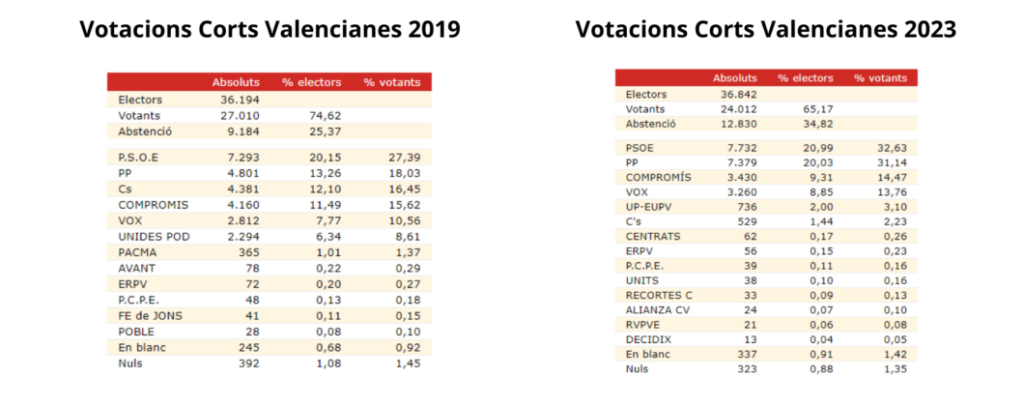 Com a punts més destacables es troba la situació de Ciutadans que ha passat de 4.381 vots en 2019 a només 529 enguany. Algo similar ocorre amb UP-EUPV que baixa de 2.294 vots a tan sols 736.