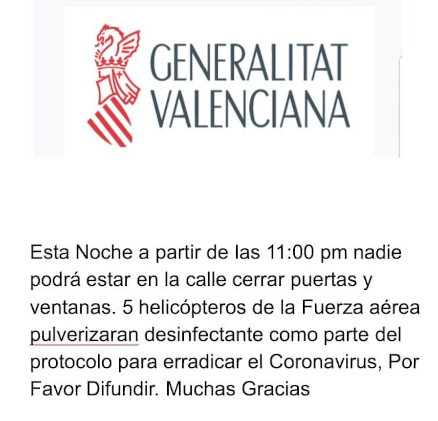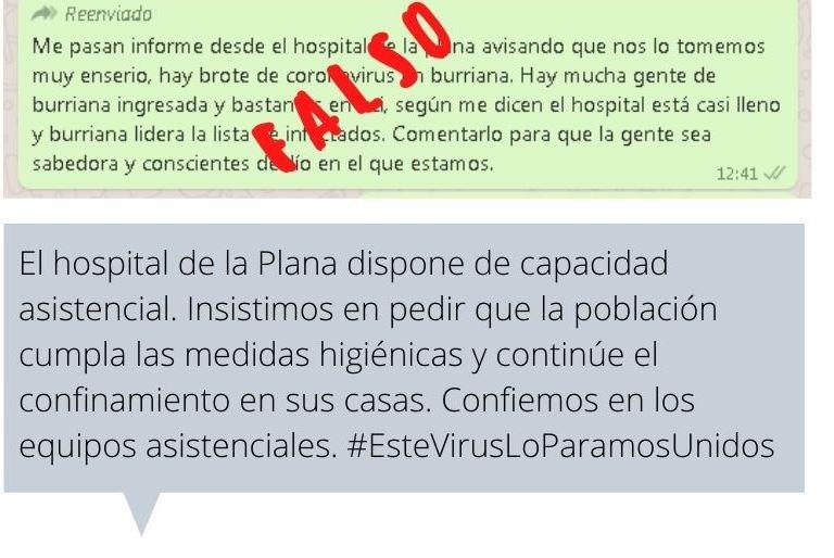 Uno de los que más se ha propagado en las últimas horas y que nos afecta a la ciudadanía de la provincia es el supuesto brote de coronavirus en Borriana y la situación de saturación por ello del Hospital de la Plana de Vila-real. Ante la rápida propagación del mensaje y la alarma que ha generado, desde el centro hospitalario han tenido que desmentir la información y han asegurado que disponen de capacidad asistencial. “Insistimos a la población que cumpla las medidas higiénicas y continue con el confinamiento en sus casas”, aclaran·