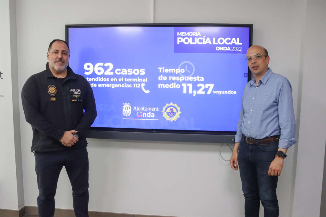 La memoria de las actuaciones de la Policía Local de Onda en 2022 vuelve a mostrar el servicio que llevan a cabo los agentes en el municipio. Entre los datos, destaca su atención eficaz y rápida a los 962 casos atendidos en el teléfono de emergencias 112, con un tiempo de respuesta medio de 11,27 segundos.