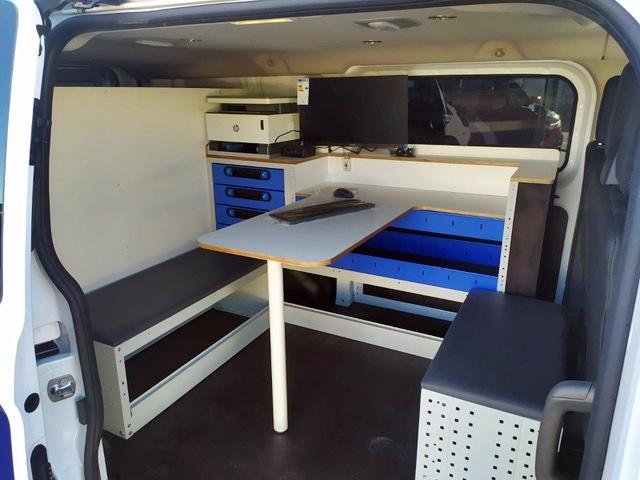 El interior del furgón contiene el mobiliario de oficina e instrumentos necesarios, para la toma de declaración o confección de informes, pudiendo estar perfectamente sentadas dos personas en su interior frente a una mesa de trabajo.