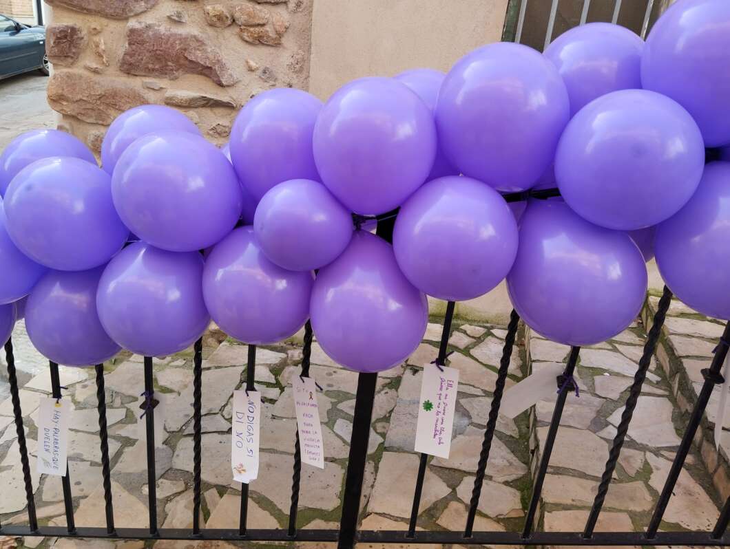 Todos ellos se han reunido esta mañana en la plaza España y han colocado en la barandilla de las escaleras de la avenida Fuente de los Baños termómetros de violencia de género y de violencia sexual (que han sido confeccionados por los estudiantes del instituto) y globos morados acompañados de mensajes de rechazo contra la violencia machista.