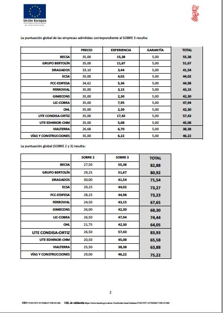 El presupuesto más ajustado fue el presentado por la UTE (Unión temporal de Empresas) Edhinor-CHM (11.992513,80 + IVA = 14.391017 euros). Pero la empresa mejor valorada por su experiencia fue la UTE Condisa-Ortiz. La puntuación en cuanto a la garantía presentada por las empresas fue la misma para todas las empresas postoras.