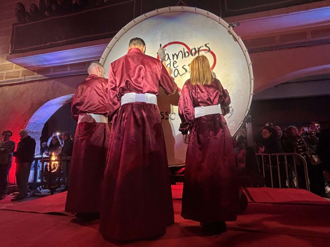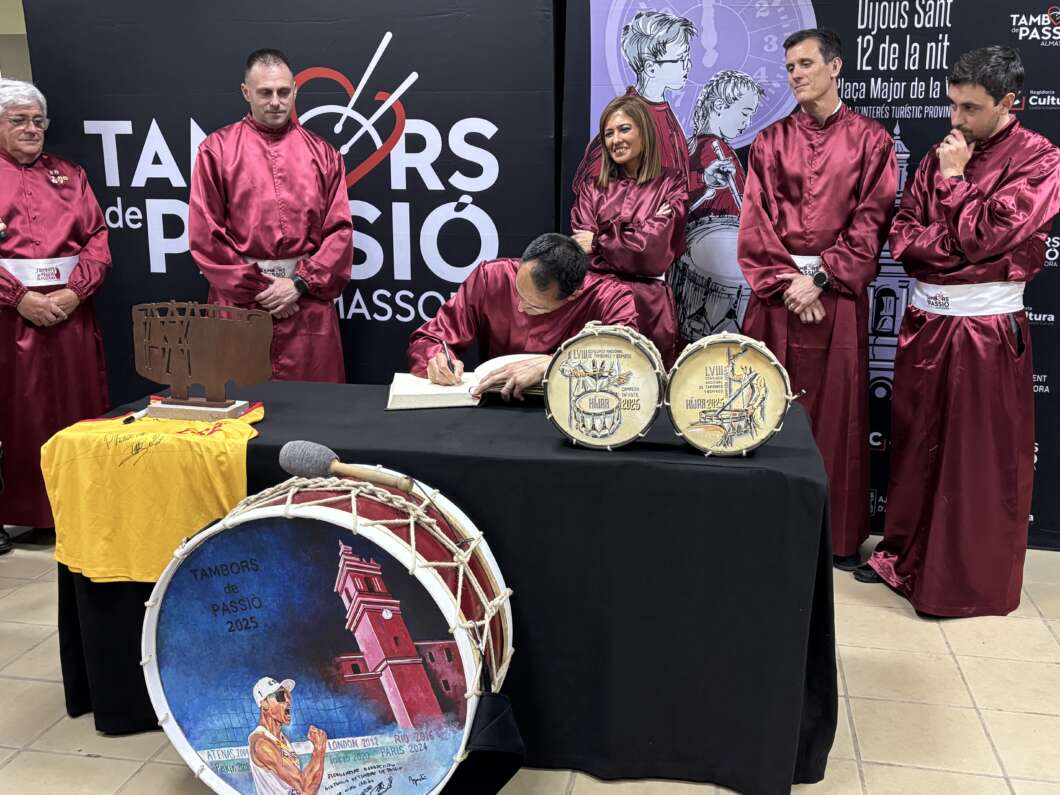 El esportista ha protagonitzat l'inici de l'acte tocant el bombo gegant acompanyat per l’alcaldessa de la localitat, María Tormo, i el president de Tambors de Passió, Damián Aguilella.
