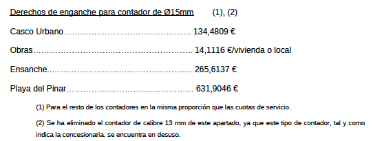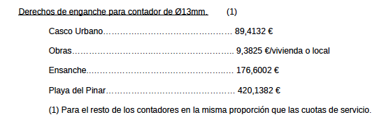 Sin embargo, lo que si que se incrementa ostensiblemente son los conceptos relacionados con los derechos de enganche para el contador, que pasa de 89,4 a 134,5 euros en el casco urbano, de 176,6 a 265,6 euros en el ensanche, y de 420,1 a 631,9 euros en la Playa del Pinar.