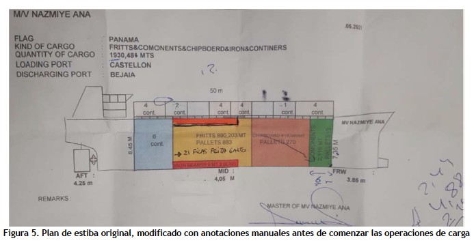 Último plan de estiba realizado durante la reunión previa a la carga, con apuntes 'a mano' (Fuente: Informe CIAIM