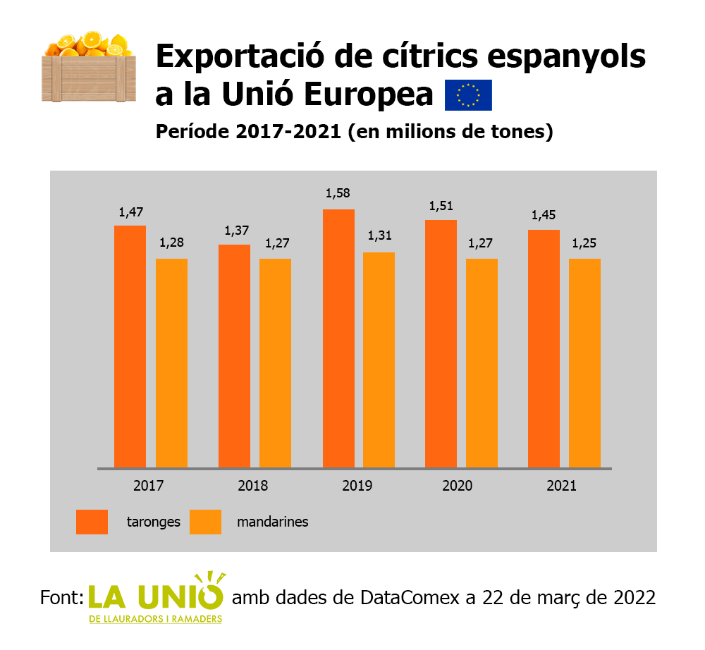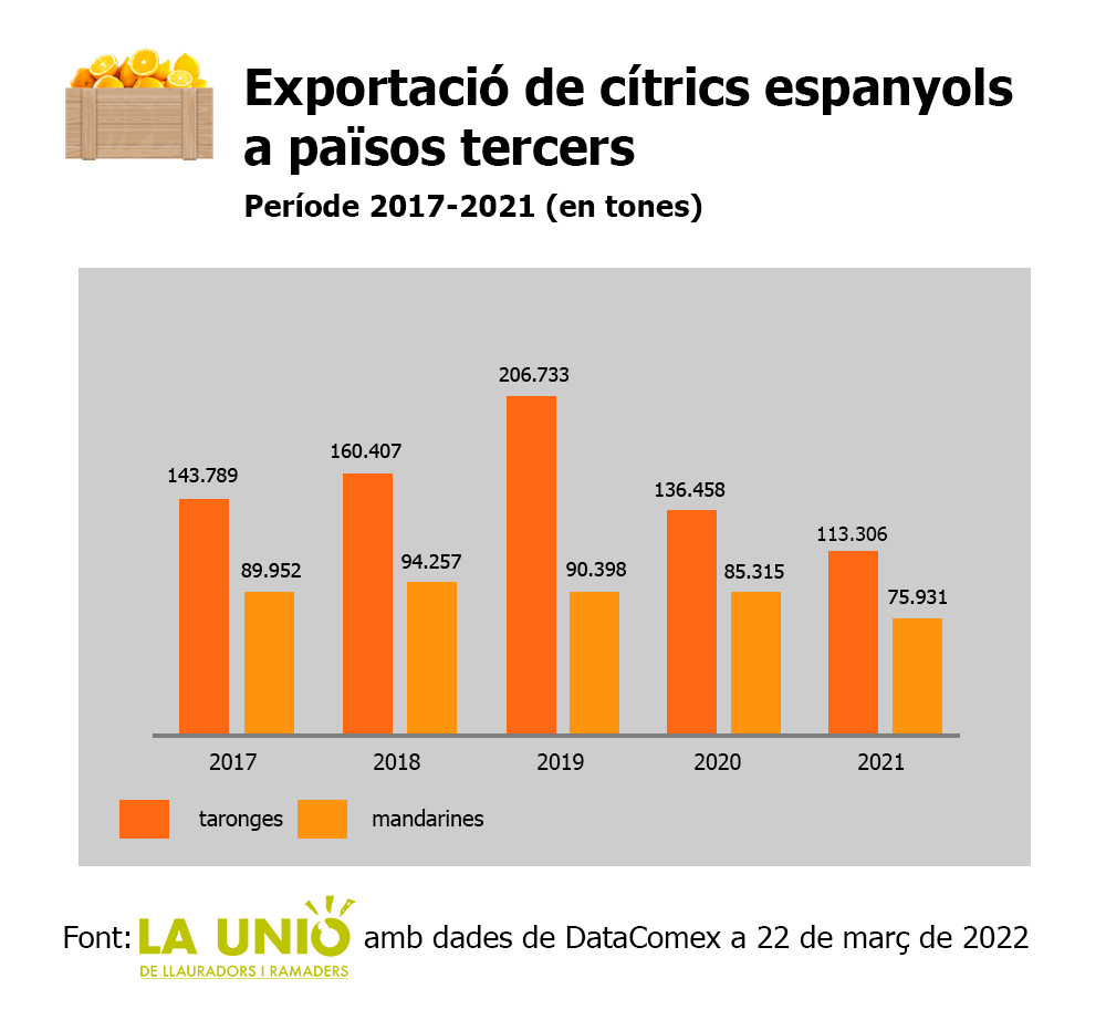 Segons les dades d'aquest informe, en els últims cinc anys les exportacions espanyoles de cítrics a països tercers han disminuït una mitjana anual del 4% i si tenim en compte els dos últims anys, 2020 i 2021, el descens és del 19% anual. El descens es dona tant en taronges com en mandarines, encara que en les primeres és més acusada, amb un índex negatiu del 45% en els últims cinc anys pel 16% en mandarines.