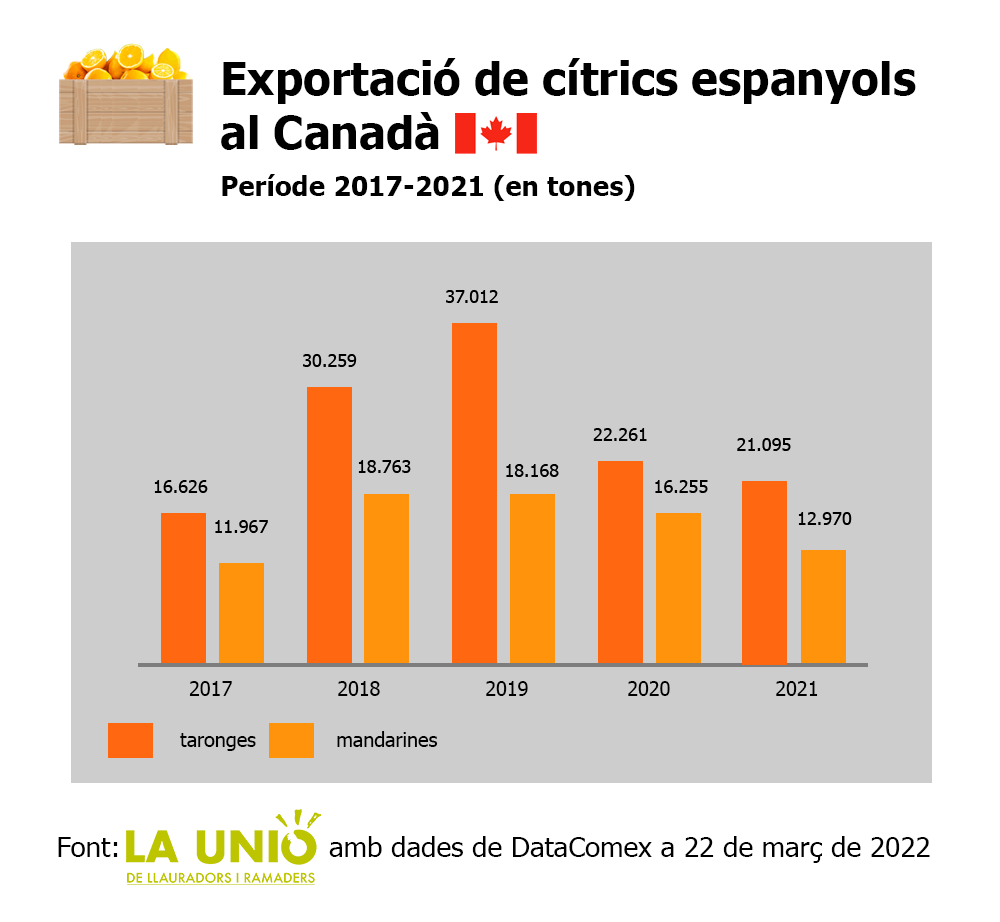 Al Canadà, que representa quasi el 20% de les exportacions de cítrics espanyols a països tercers, la disminució l'any passat va ser del 34% (43% en taronges i 29% en mandarines).