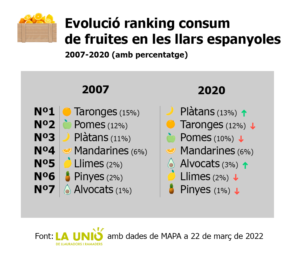 Un altre estudi de Cajamar també incidia en què tradicionalment, la taronja era la fruita per excel·lència de la tardor i l'hivern. No obstant això, cada vegada hi ha més productes substitutius que competeixen pels mateixos consumidors. L'altra fruita tradicional dels mesos més freds, com és la poma, ha sigut capaç de reinventar-se amb una gran diversitat de varietats amb colors i textures diferents. I amb una potent labor de comunicació realitzades per determinades empreses. Actualment, en qualsevol supermercat de qualsevol país europeu és molt més àmplia i diversa la part del lineal dedicada a fruita de llavor que a cítrics. La globalització dels intercanvis està permetent també que l'oferta de fruites exòtiques i tropicals siga molt major durant aquests mesos. Les postres làcties continuen atraient l'atenció del consumidor gràcies a la seua diversitat, a les campanyes de promoció i al seu intent d'associar-los cada vegada més a les propietats beneficioses per a la salut.