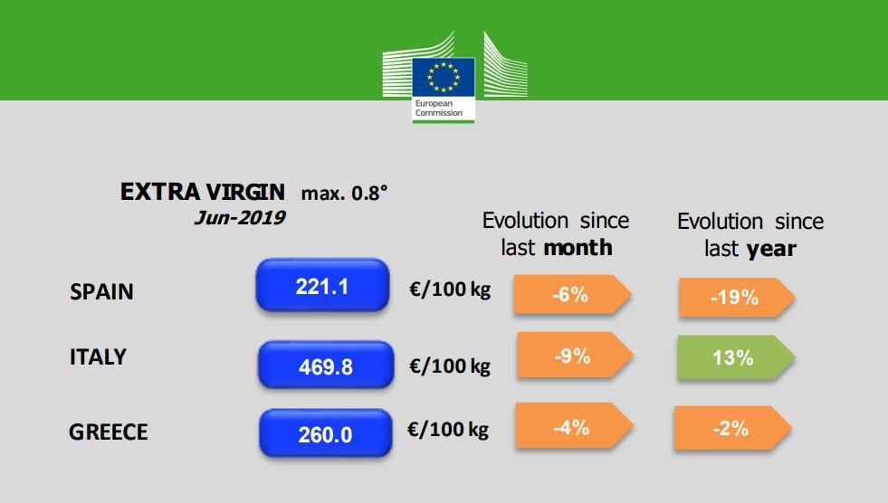 Destaca que los datos ofrecidos por la Comisión Europea en junio revelan que el precio del aceite de oliva virgen extra (AOVE) en Italia (469,8 €/100 kg) fue notablemente mayor que en España (221,1 €/100 kg) o Grecia (260,0 €/100 kg), algo bastante llamativo, así como la evolución de los precios respecto al pasado año, con un aumento del 13% en Italia y una disminución del 2% en Grecia y de un 19% en España.