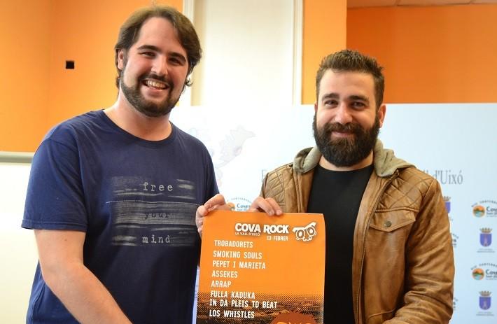El concejal de Juventud del Ayuntamiento de la Vall d'Uixó, Jordi Julià, y el presidente del Casal Jaume I, Marc Seguer, han presentado esta mañana la segunda edición del festival Cova Rock, que por primera vez tendrá un componente solidario, ya que el 50% de la recaudación de las entradas se destinará a la asociación Smara y se recogerán alimentos para los campamentos de refugiados saharauis.