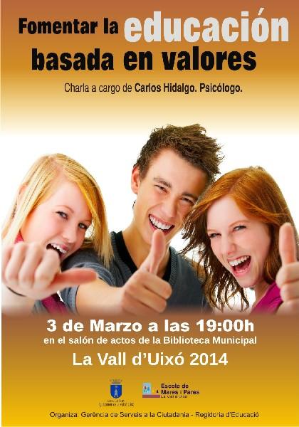 El Ayuntamiento de la Vall d’Uixó, a través de la concejalía de Educación, ha organizado una charla sobre “Educar en valores” a cargo del psicólogo experto en materias educativas, Carlos Hidalgo. La cita será el lunes 3 de marzo a las 19 horas en la biblioteca municipal Mª Dolores García.