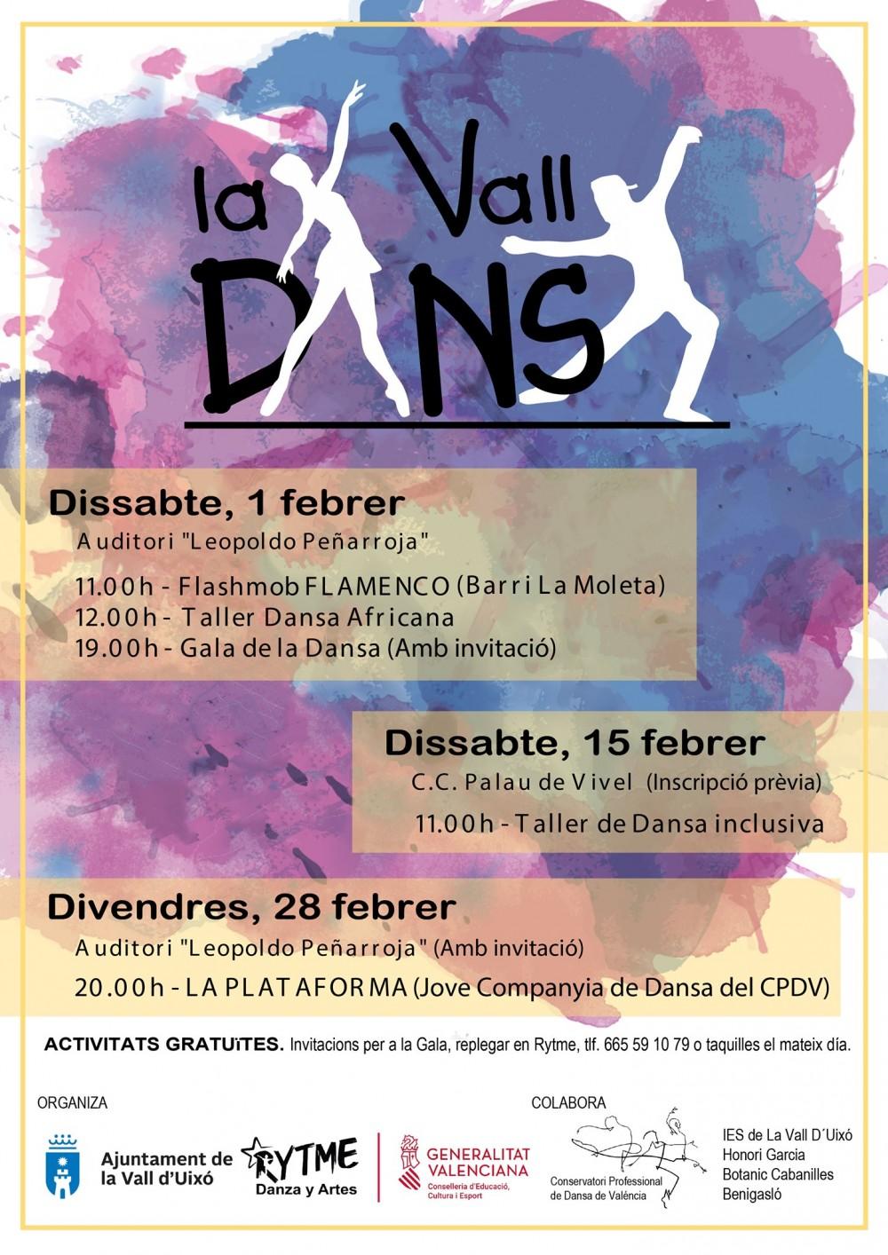 El Ayuntamiento de la Vall d'Uixó presenta la tercera edición del programa La Vall Dansa, en el que se celebrarán actividades gratuitas durante todo el mes de febrero para conmemorar el mes de la danza. Las actividades empezarán el 1 de febrero, en el Auditorio Leopoldo Peñarroja, con un flashmob flamenco, con el taller de danza africana y con la Gala de la Danza; el día 15 de febrero se llevará a cabo en el Palau de Vivel el taller de danza inclusiva y, por último, el 28 de febrero se realizará, también al Auditorio Leopoldo Peñarroja, el espectáculo 'La Plataforma', a cargo de la Joven Compañía del Conservatorio Profesional de Danza de València.