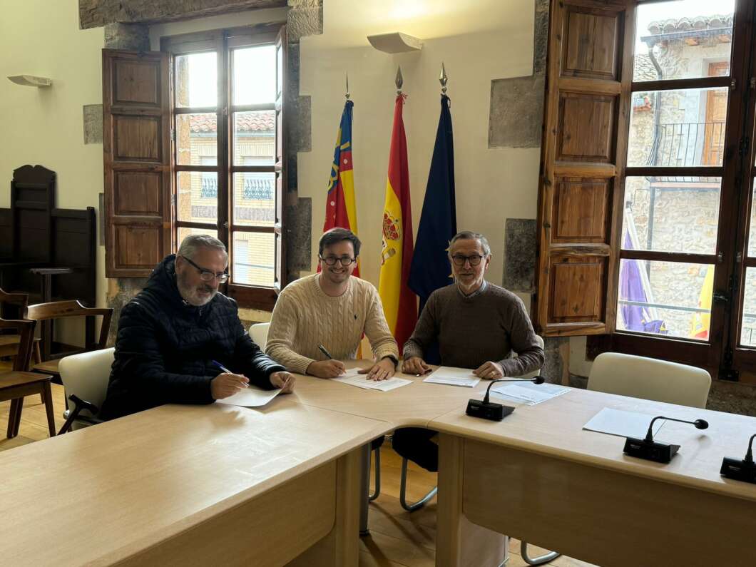 El alcalde de la Villa de El Toro, José Arenes, firma un convenio con el párroco del templo, Miguel Pedro León, y el vicario general de la diócesis de Segorbe-Castellón, Javier Aparici
