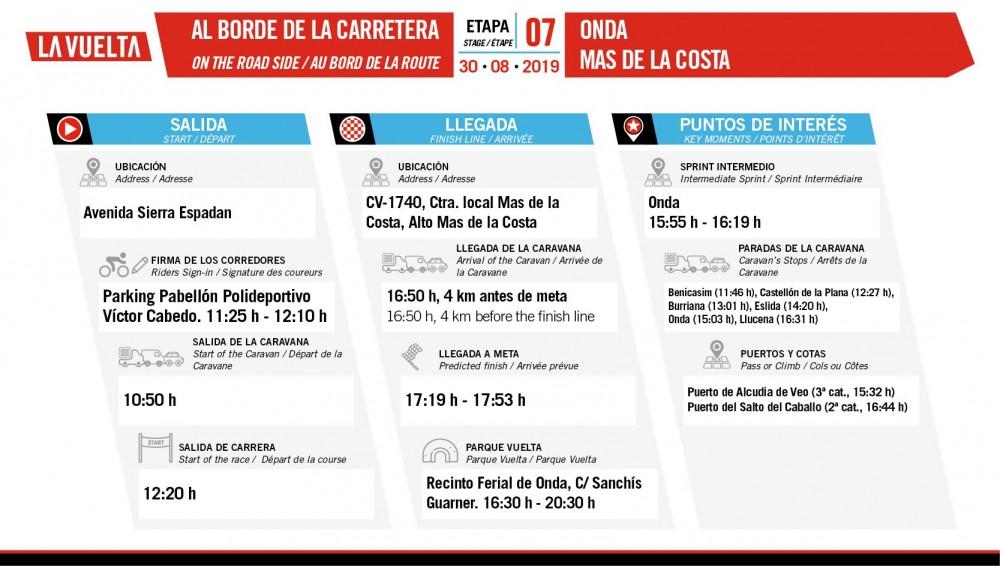 La séptima etapa de La Vuelta a España 2019 transcurre integra por la provincia de Castellón y tiene previsto pasar por veintiuna localidades, entre ellas la capital de la Plana. Constará de 183,2 kilómetros y tendrá, como principal dificultad para los corredores, el puerto de montaña de tercera categoría, correspondiente al Puerto del Matet, con 3,7 kilómetros de subida y un desnivel de 5,5%. Unirá el municipio de Onda con el alto del Mas de la Costa, en el término municipal de Lucena del Cid, en la comarca de L'Alcalatén.