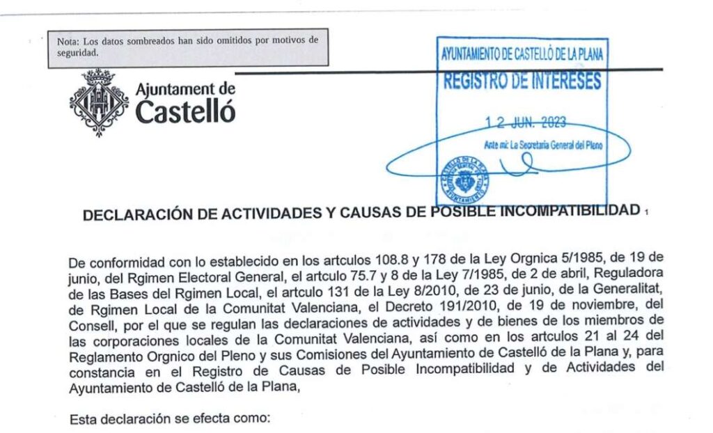 Otras fuentes municipales han señalado a Castellón Información, que estaban ‘dentro de plazo’. Lo cierto es que estos documentos ya estaban presentados, porque sin eso no hubieran podido tomar posesión como concejales… pero parece que había que seguir determinados trámites técnicos.