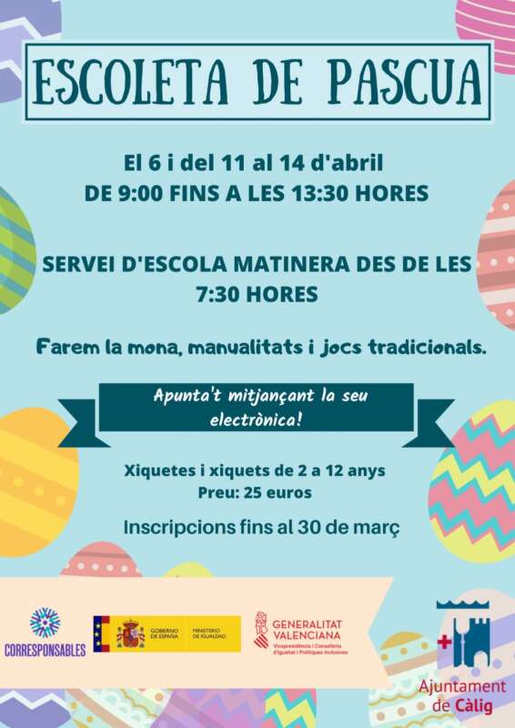 L’Ajuntament de Càlig oferirà un any més l’Escoleta de Pasqua perquè els xiquetes i xiquetes puguen gaudir d’un oci educatiu durant les vacances de Setmana Santa, al mateix temps que s’ajuda als pares i mares a conciliar la vida laboral amb la familiar.