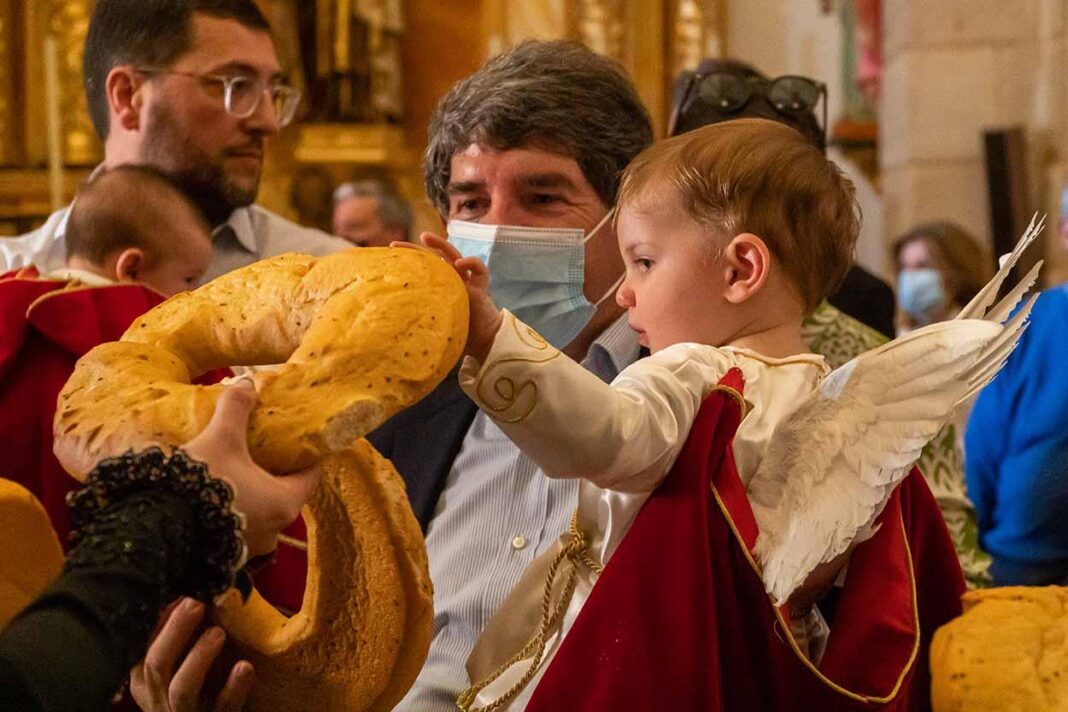 Tras la finalización de los actos en San Cristóbal, los romeros han bajado al pueblo. En la puerta del Calvario les esperaban las autoridades, acompañadas de la reina y las damas, la banda de música, la 'Colla de Gegants i Cabuts' y los ‘angelets’, niños menores de tres años que son vestidos para la ocasión con túnica, capa, aletas de palomo y corona, representando la inocencia de los más pequeños. Juntos se han dirigido hasta la parroquia donde se procedido al reparto de los rollos, bendecidos el día anterior.
