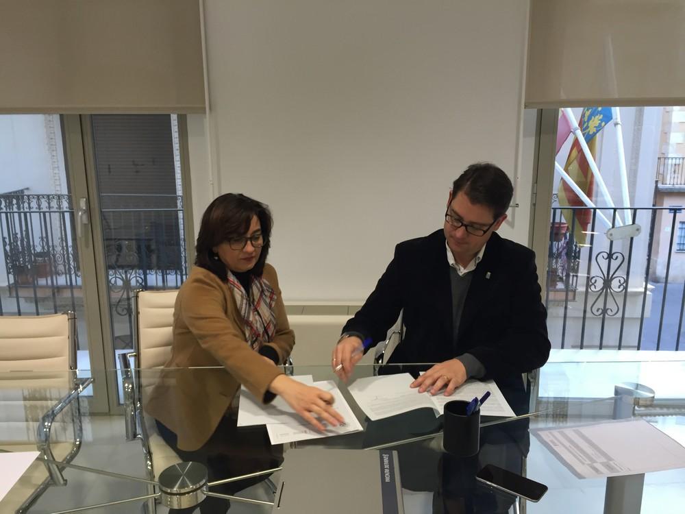 El alcalde de l’Alcora, Víctor Garcia, y la directora general de la Entidad de Infraestructuras de la Generalitat (EIGE), Blanca Marín, han firmado un convenio a favor del Ayuntamiento para la cesión de uso del local, situado en la calle País Valencià, destinado a la instalación de un centro de día.