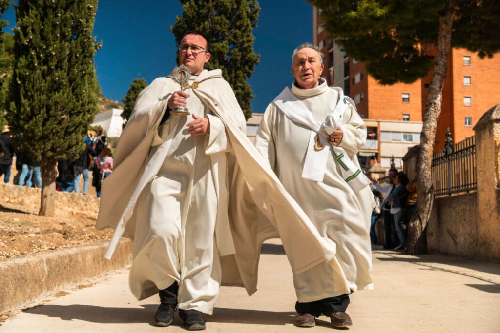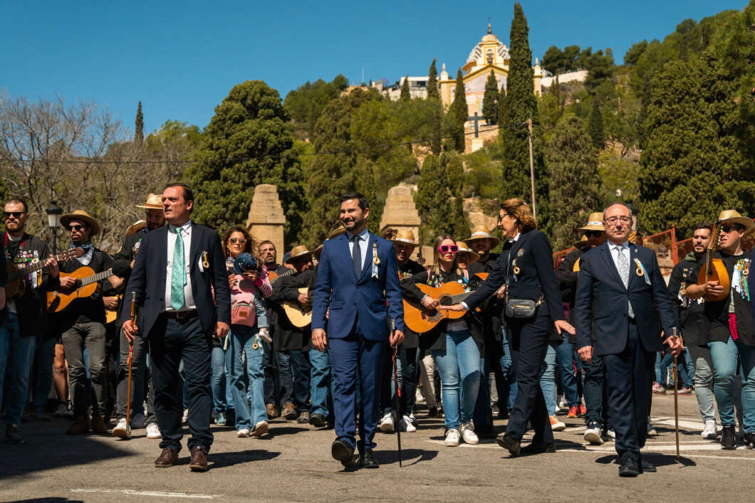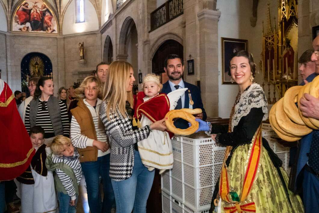 Després de la finalització dels actes en Sant Cristòfol, els romers han baixat al poble. A la porta del Calvari els esperaven les autoritats, acompanyades per la Cort d'Honor, la banda de música, la rondalla, la 'Colla de Gegants i Cabuts' i els ‘angelets’, xiquets i xiquetes vestits per a l'ocasió amb túnica, capa, aletes de colom i corona, representant la innocència dels més xicotets. Junts, en processó, s'han dirigit fins a la parròquia on es procedit al repartiment dels rotllos, beneïts el dia anterior.