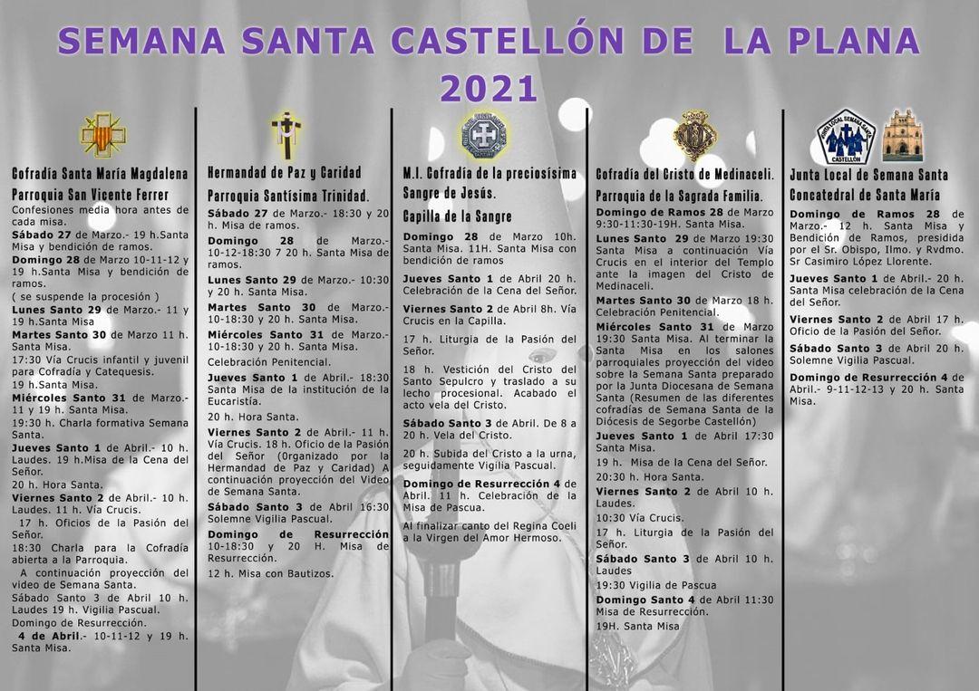 Las Cofradías de Castelló y la Junta Local de Semana Santa han anulado este año las procesiones de Semana Santa, así como otros actos religiosos que habitualmente organizaban en la calle por la pandemia por el coronavirus. Estas son la Cofradía Santa María Magdalena (parroquia San Vicente Ferrer), la Hermandad Paz y Caridad (parroquia Santísima Trinidad), la Cofradía de la Purísima Sangre de Jesús (capilla de la Sangre), la Cofradía del Cristo de Medinaceli (parroquia de la Sagrada Familia), y la Junta Local de Semana Santa (concatedral de Santa María).