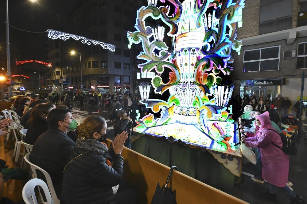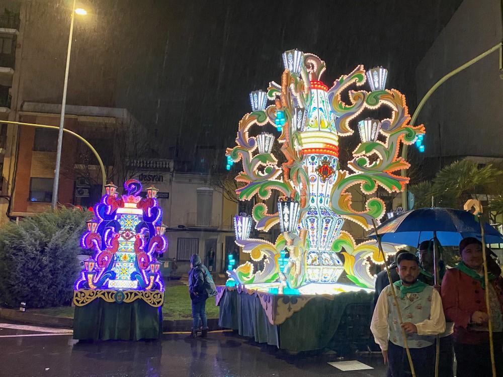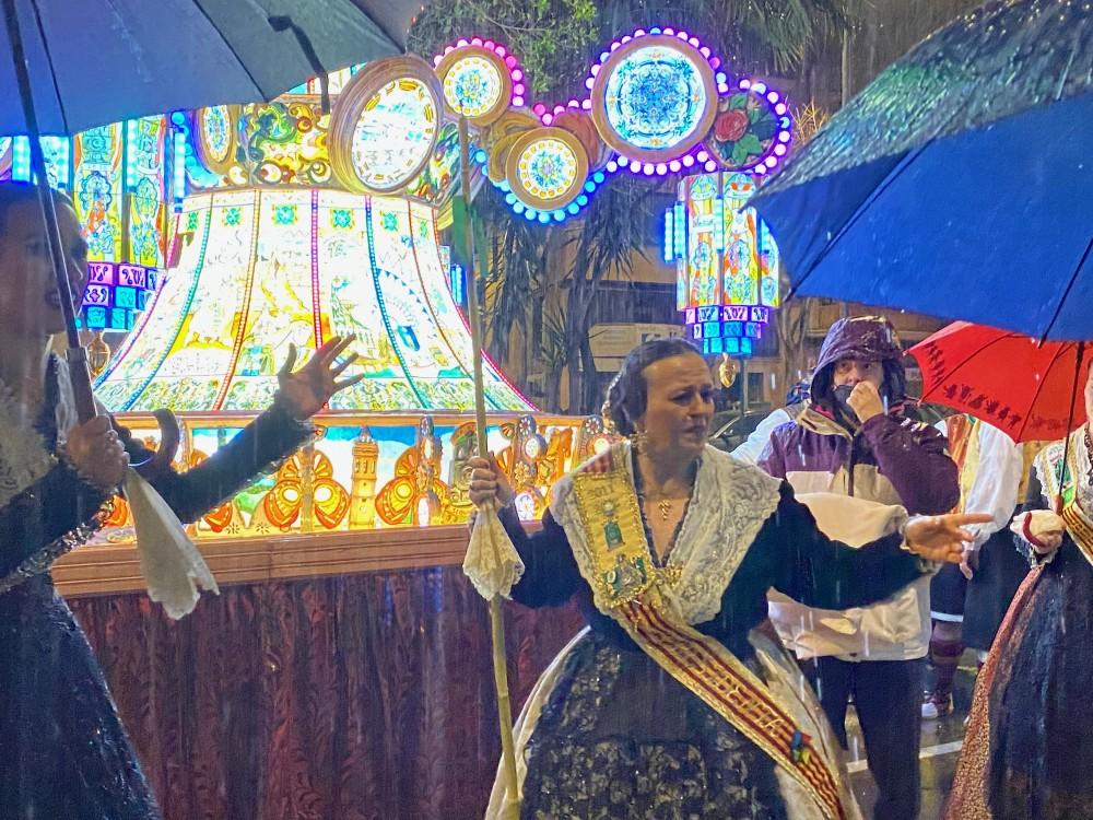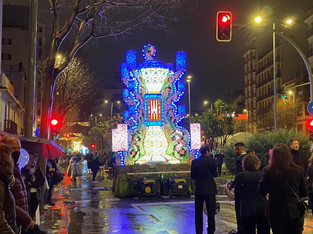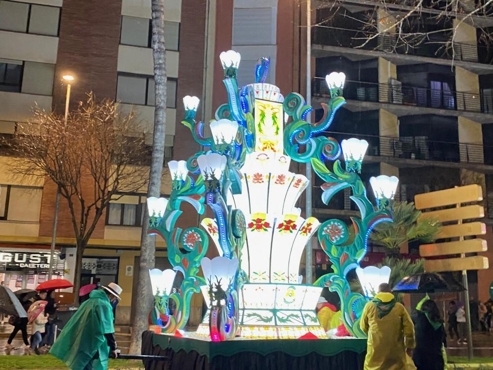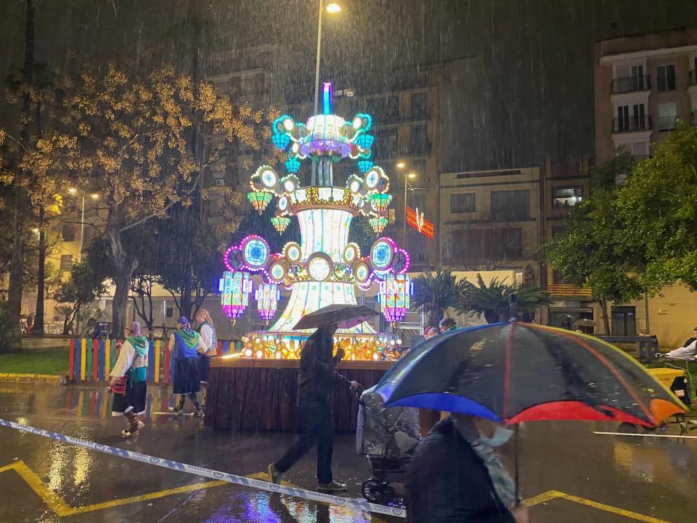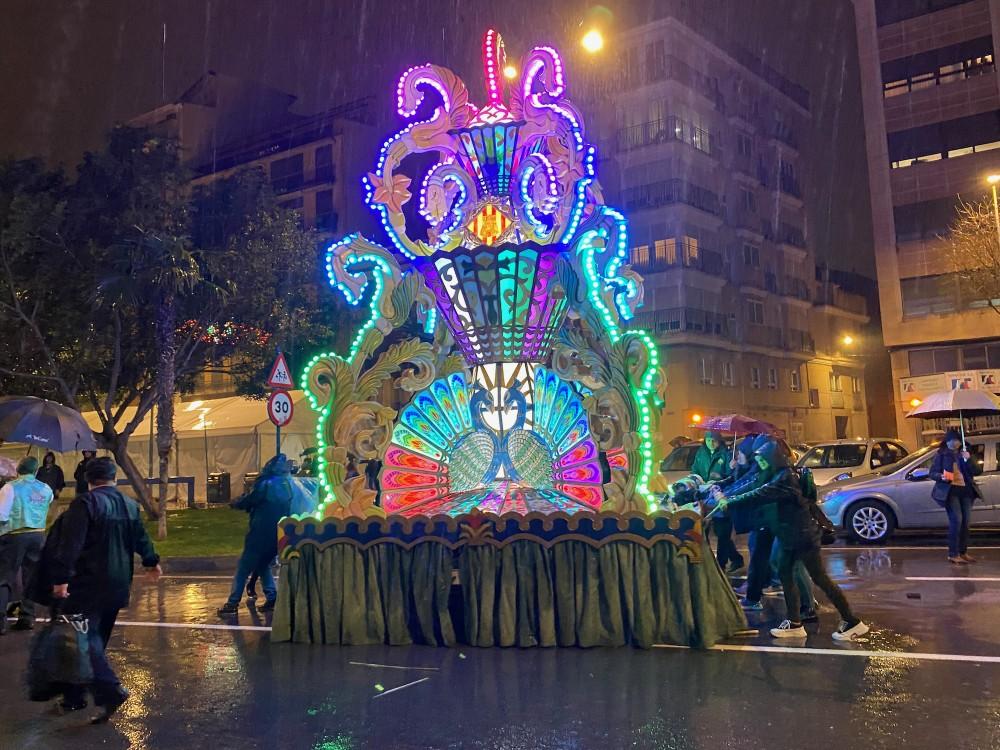 Pero la lluvia débil de por la tarde generó problemas, unas gaiatas no arrancaban, los grupos que tenían que suministrar la luz al monumento, fallaban. Y así los problemas de última hora se sucedían y faltaban manos para cumplir con la misiva de que fuera un desfile ligero, sin parones ni contratiempos.